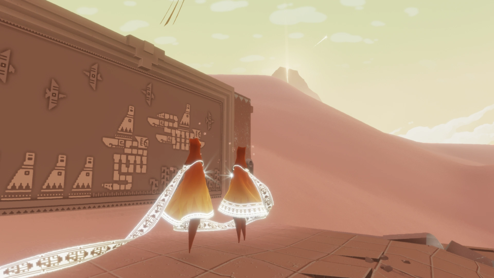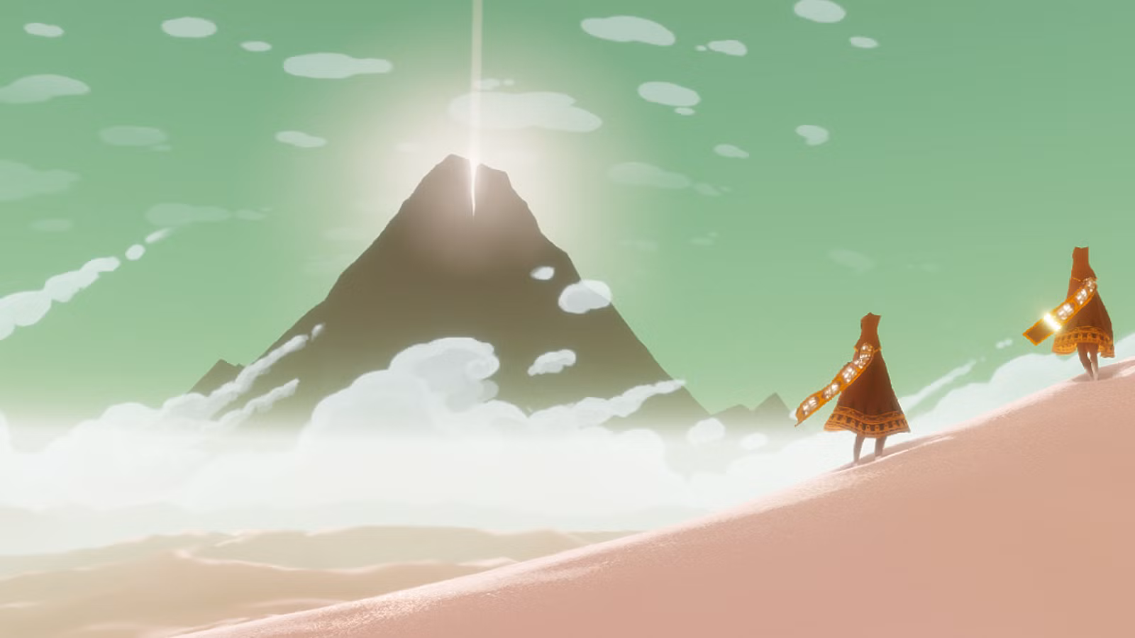 Le sound design de Journey est essentiel à son immersion et à son émotion. Chaque pas dans le désert, le glissement sur le sable ou le mouvement du voile du personnage est accompagné de sons subtils et réactifs, qui renforcent la fluidité et la sensation de présence. Les interactions avec l’environnement et avec d’autres voyageurs se traduisent par des tonalités éthérées, qui s’accordent à la musique orchestrale et réactive pour créer une communication silencieuse mais expressive. Cette combinaison transforme chaque déplacement et rencontre en expérience sensorielle poétique et profondément immersive.